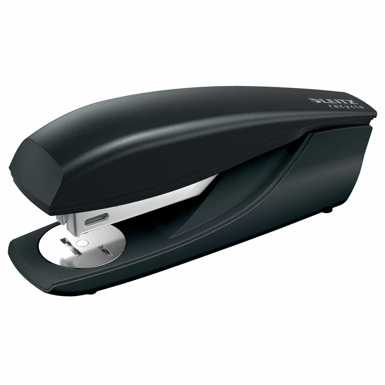 Iøjnefaldende, premium hæftemaskine lavet af post consumer genanvendt plast til hverdagsbrug. Klimaneutral og 100% genanvendelig, da den kan demonteres fuldstændig i de forskellige materialetyper. Patenteret Direct Impact Teknologi og Leitz Power Perfor